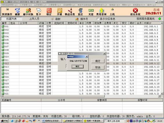 首先,我们可以先对此卡进行一下更新(IC卡管理-IC卡信息更新)然后去看看此卡的状态;若刚安装完成,则可能是未下载网吧上网卡信息;若正常运行一段时间后出现此类问题,可能是不小心清空了上网卡信息也可能此卡已被删除(名字带有非法字符的)。这两种情况都需重新下载上网卡信息,被删除的上网卡需要重新办理;另一种情况可能你的视频一卡通服务器端目前的状态为离线状态。