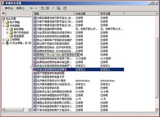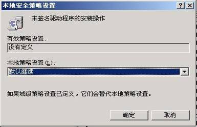 在未签名驱动程序的安装操作的属性栏中的本地策略设置项选择默认继续