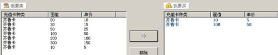 左侧为选中齐鲁卡时,显示出齐鲁卡的所有面值,包括10元、20元、30元、50等、100元、200元、300元等,如果用户想要购买10元面值一张、100元面值一张,则在左侧窗口选中后,点击中间的-〉按钮,即可将其添加到右侧窗口中。