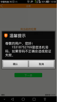 ③ 点击“下一步”,弹出如下图提示,提示用户再次确认输入的手机号码是否正确。