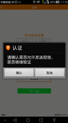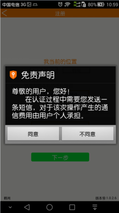 点击“确定”按钮后,会弹出如下声明,告知用户本次注册过程中,app会自动发送一条验证短信(以后使用过程中绝不会再次发送短信)。