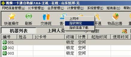 一卡通指纹仪首先在网吧让网民绑定指纹,就是把网民的身份证信息和指纹信息进行绑定,然后网民直接刷指纹进行上网或者下机。