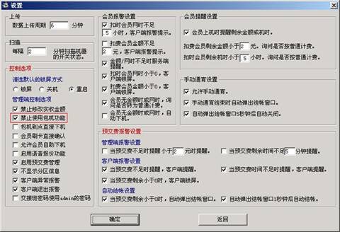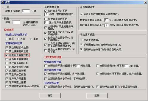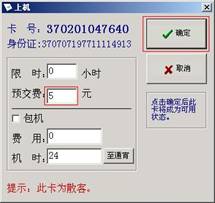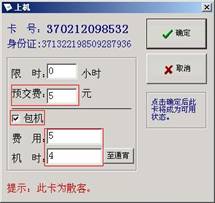 l 在预付费模式下,限时栏中不必填写任何内容,系统会自动按照设定的单价和计费规则,计算实际预交费所对应的上网时间,并在预交费用完时采取对应的措施,如结账或锁屏等;一旦在限时栏中填写了时间,则在预交费对应的上网时间与填写的限时时间两者之中,系统会自动以先到达的时间为准,如:单价为2元,限时时间为2小时,预交费为5元,虽然按照预交费和单价实际上机时间应该为2.5小时,但是系统会在2小时后即行结账;除非限时栏中填写的时间与按照预交费用计算出的应上机时间恰好一致,才会确保在正确的时间让顾客下机,但是这又明显没有必要,因此在预付费模式下,建议不必填写;