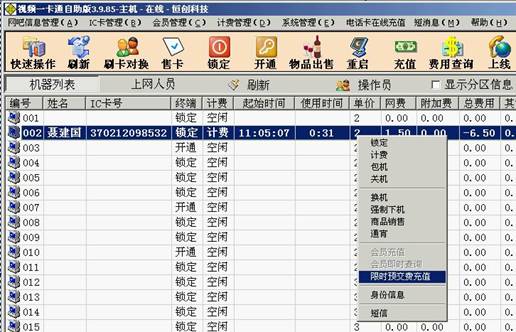在主界面中所有已登录的顾客将会以蓝色字体高亮度显示,根据编号或者上网卡卡号选中该顾客,点击鼠标右键,在弹出菜单中选择限时预交费充值选项,如下图: