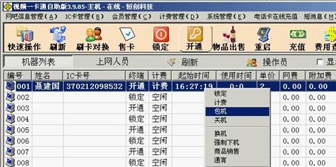 某些散客(指不是会员)在上机一段时间后,希望转为包机模式上机,此时可在主界面中先选中该用户,然后单击鼠标右键,在弹出菜单中选择包机选项,如下图所示:
