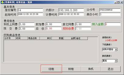 点击结帐窗口中的结帐按钮,即可将该用户结帐下机。