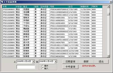 以本地IC卡列表为例,其中不但可以按照时间段或者IC卡号进行更具体的查询,而且可以看出本网吧已经销售的/购买的/挂失的上网卡的数量等信息。如下图所示: