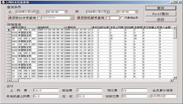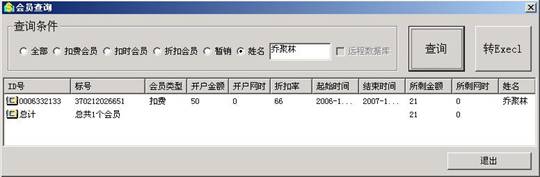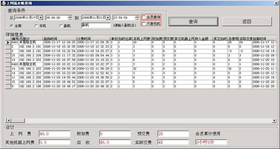 在这个窗口中不但可以按照日期和时间查询所有信息,也可以单独只查找会员交费情况和包机交费情况。