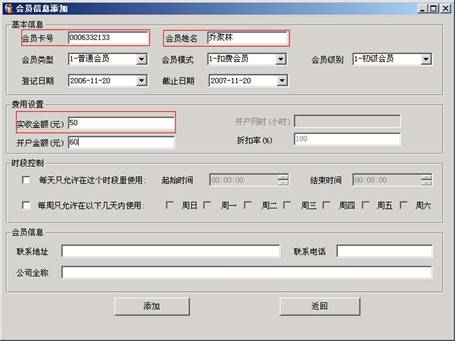 在会员卡号栏中刷卡输入顾客的上网卡卡号,在会员姓名中点击鼠标,可以自动得到该上网卡使用人的姓名;只需在实收金额栏中填写实际交纳现金数额,系统会按照会员方案中的设置,自动生成开户金额;根据实际情况填写其他栏目,点击添加按钮即可将该顾客办理为本网吧的会员。