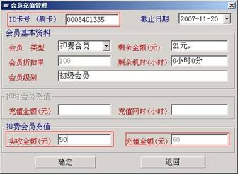 在ID卡号(刷卡)栏中刷卡输入会员的上网卡号,在实收金额(元)栏中按照该会员实际交纳的现金数额填写,系统会按照会员方案的设置在充值金额栏中自动生成充值金额,点击确定按钮即可。