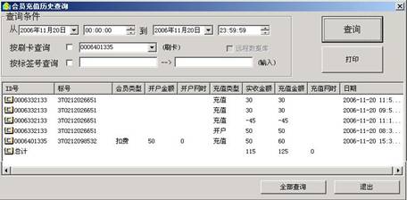 如果要查询会员充值历史,可以使用会员管理菜单中的会员充值查询功能,在如下的查询界面中,可以按照时间段、特定卡号等标准查找相应的会员充值记录。