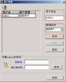 l 首先点击窗口左侧系统默认的唯一用户admin,使其用户名和管理级别分别显示在窗口右侧对应的栏目中,同时激活添加和修改按钮;