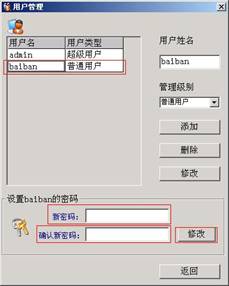 l 点击窗口左侧中名为baiban的用户,使其用户名和管理级别分别显示在窗口右侧对应的栏目中,然后在新密码栏和确认新密码栏中分别输入将要为该用户分配的密码,再点击修改按钮即可;以后要修改某个用户的密码也可以同样进行;