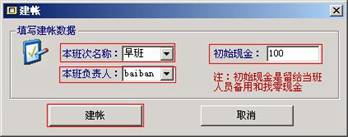 在本班次名称栏里选择早班(系统默认按照三班倒设置,此处选择早班不会对两班制的网吧建账和交接班有任何影响),在本班负责人栏里选择baiban,在初始现金栏里填写用于当班人员找零用的现金数额,点击建账按钮即可;