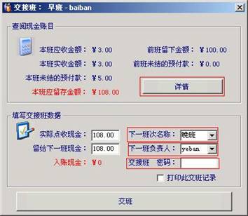 如果老板对自己的白班和夜班收银员非常放心,允许他们自行交接班,则在交接班密码处输入下一班接班者的密码即可,意为现金接收人已经认可上班的账目。