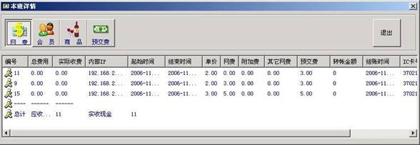如果密码正确,可以看到如下的网费、会员交费、商品零售、预交费等详情: